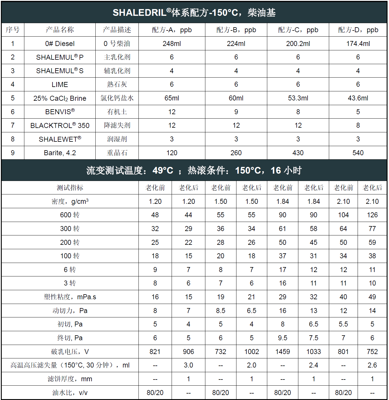 SHALEDRIL® 可用柴油或白油配制而成,已在长宁、威远、涪陵和秋林等页岩气和致密气区块得到了上百口井的应用,可以多次循环使用,被证实是可实现降本增效的常规油基钻井液体系。