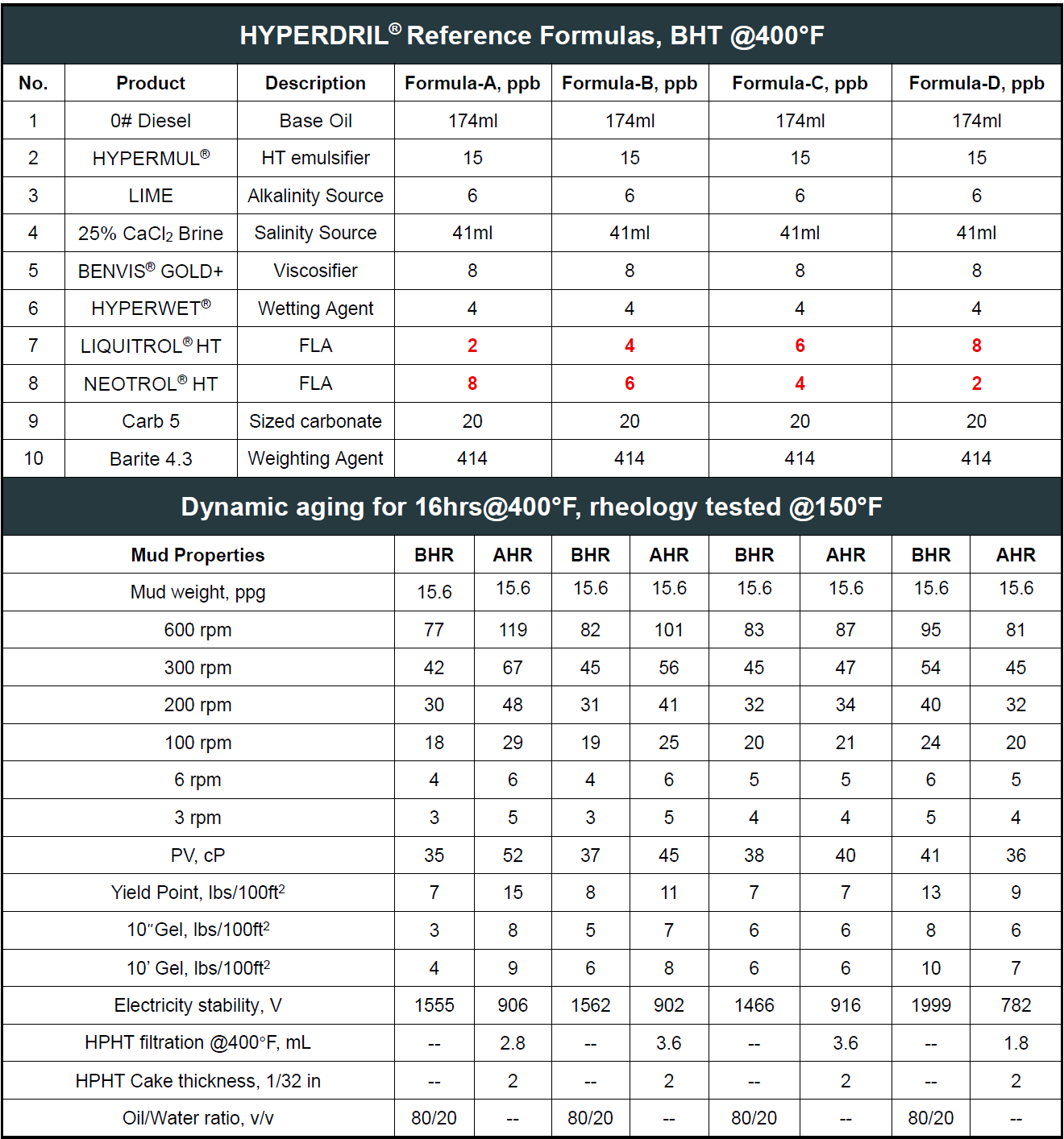 ¬ Combination of LIQUITROL® HT or NEOTROL® HT and CARB 5 are recommended to add into the formulation to enhance better thermal stability of the system and less filtration control.